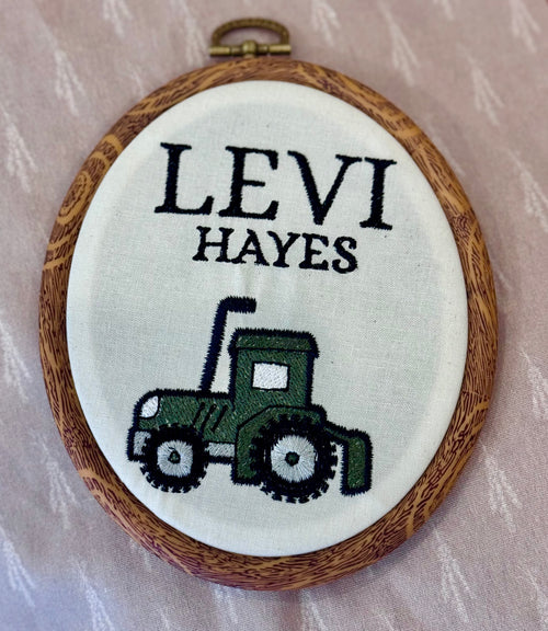 Personalized Tractor Embroidery Hoop – Custom Baby Name Nursery Decor (4.7” x 6”)