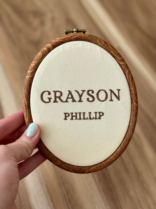 Custom Embroidered Name Hoop – Personalized Baby Name Wall Art – Neutral Nursery Decor – Handmade Embroidery Keepsake